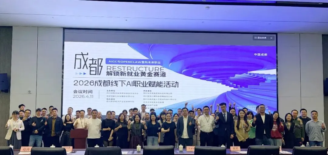4月11日,由四川省创新创业促进会商业文化学会主办,四川数字经济产业发展研究院协办的“AI重构未来职业,解锁新就业黄金赛道”2026成都线下AI职业赋能活动在成都市AI数字创智元AIGC实训基地举行。四川省创新创业促进会执行秘书长杜春花出席活动,华享创联党支部书记、副总经理陈雷,眉山区域总经理牛开携团队参加本次分享会。