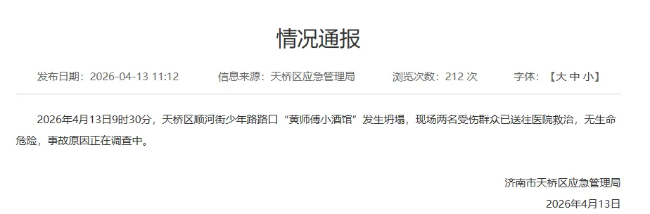 4月13日,济南通报一沿街商铺发生坍塌:致现场两名群众受伤,已送医救治,无生命危险。