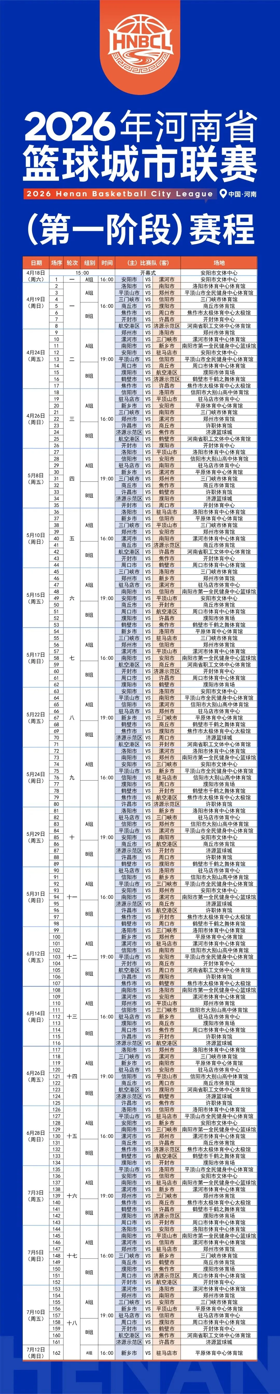 2026年河南省篮球城市联赛将于4月18日(周六)15:00在安阳市文体中心开幕,第一阶段赛程正式公布↓