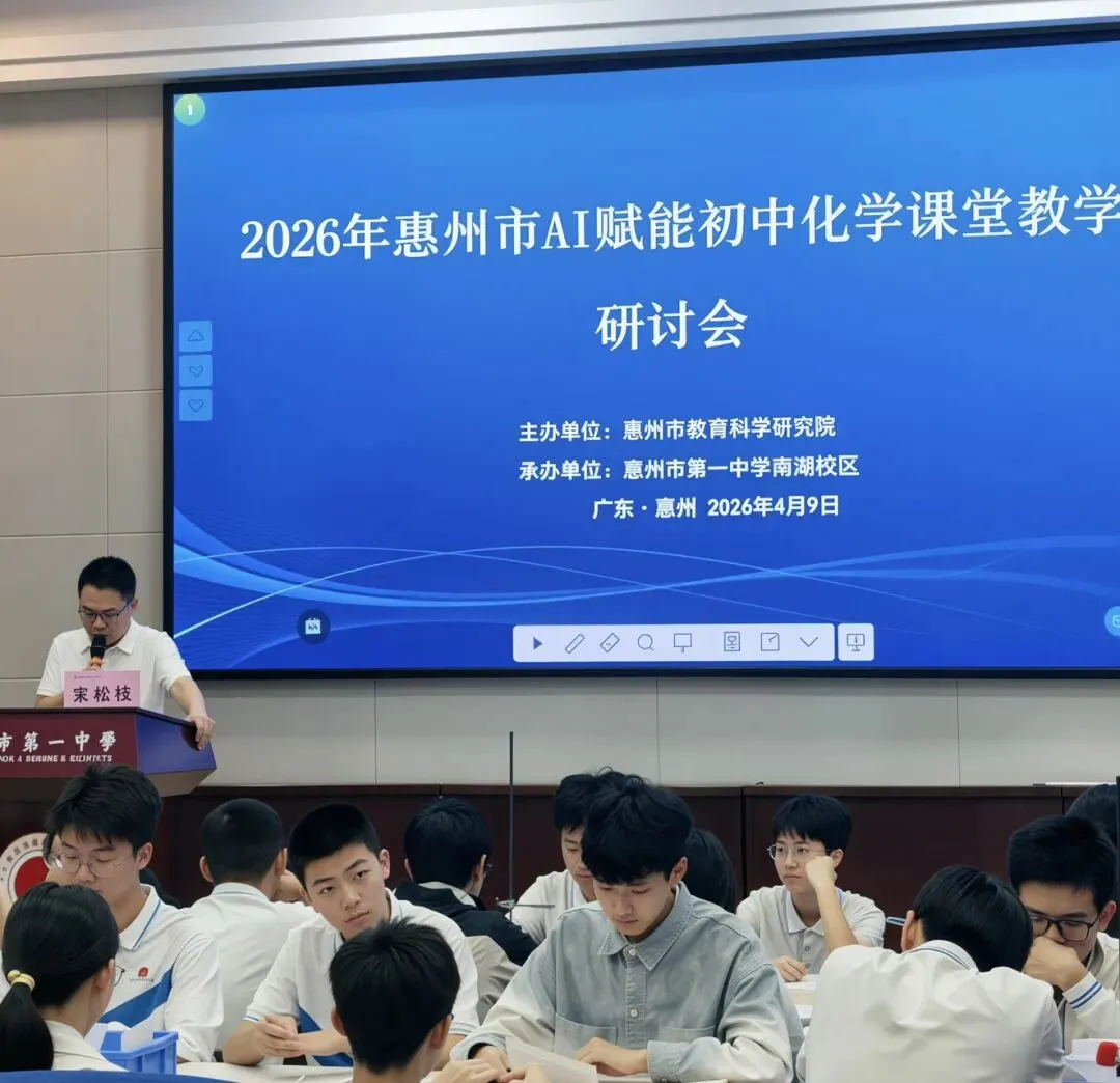 为积极探索人工智能技术与学科教学深度融合的有效路径,推动 AI 技术在初中化学课堂中的实践应用,提升教师数字化教学能力与课堂育人质量,2026年惠州市AI赋能初中化学课堂教学研讨会于4月9日在我校南湖校区举行。本次研讨会由惠州市初中化学教研员宋松枝主持,全市各区县初中化学教师齐聚一堂,共探AI赋能教学新方法,共研学科教研新方向。