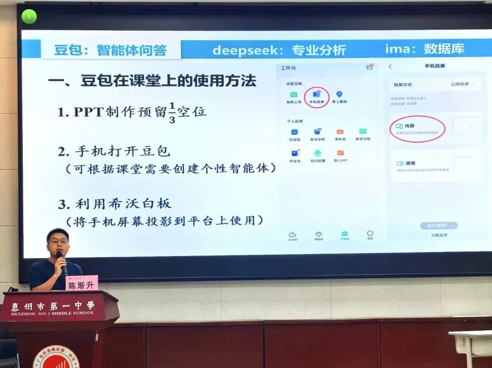 惠阳区新圩中学陈渐升老师以《AI 助力学生个性化发展:教师可直接上手的实操指南》为题,结合教学实践,细致分享豆包、Deepseek、ima三款 AI 工具的使用场景与操作技巧。陈老师介绍了豆包在课堂互动、角色扮演等场景中的应用,并详细讲解 AI 智能体的创建流程,让教师能够快速打造个性化课堂互动助手,深入讲解 Deepseek 在学生试卷精准分析等方面的强大功能,助力教师实现精准教学与个性化辅导,全面展示ima工具基于本地知识库实现分层出题、中考热点归纳、针对性强化练习的优势,有效解决教师分层教学不易落地等痛点。