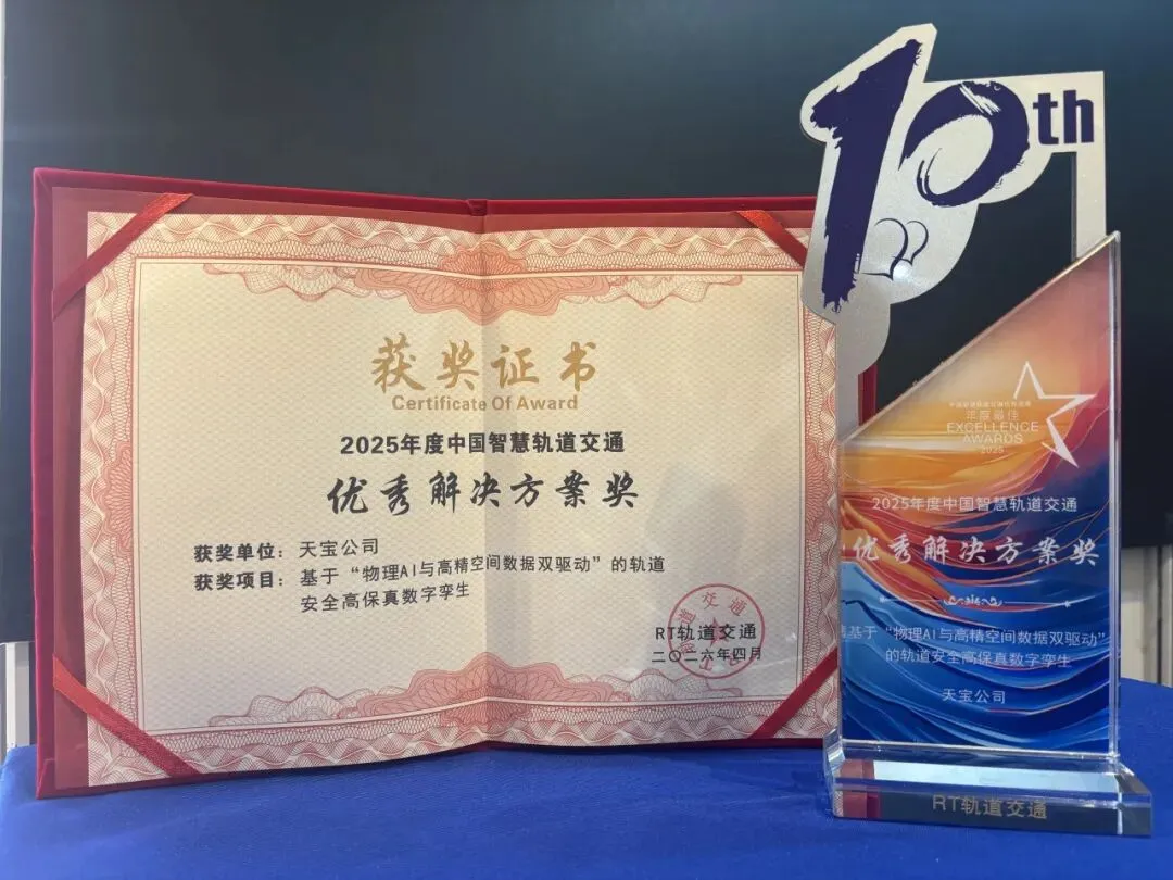此外,凭借在轨道交通数字化领域的突出创新与实践成果,天宝《基于“物理AI与高精空间数据双驱动”的轨道安全高保真数字孪生》项目成功斩获“2025年度优秀解决方案奖”。这份荣誉既是行业对天宝技术实力与行业贡献的权威认可,也为天宝持续深耕轨道交通领域注入更强动力。