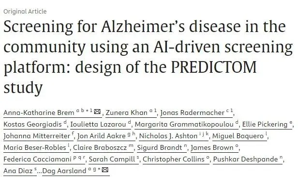 PREDICTOM全称为利用人工智能驱动的筛查平台预测阿尔茨海默病,是一项由创新健康倡议联合资助的公私合作项目,旨在构建并临床验证一个开源、可互操作的筛查平台,支持在家庭和社区医疗环境中远程收集数字化和生物标志物数据,从而实现阿尔茨海默病风险人群的大规模识别。