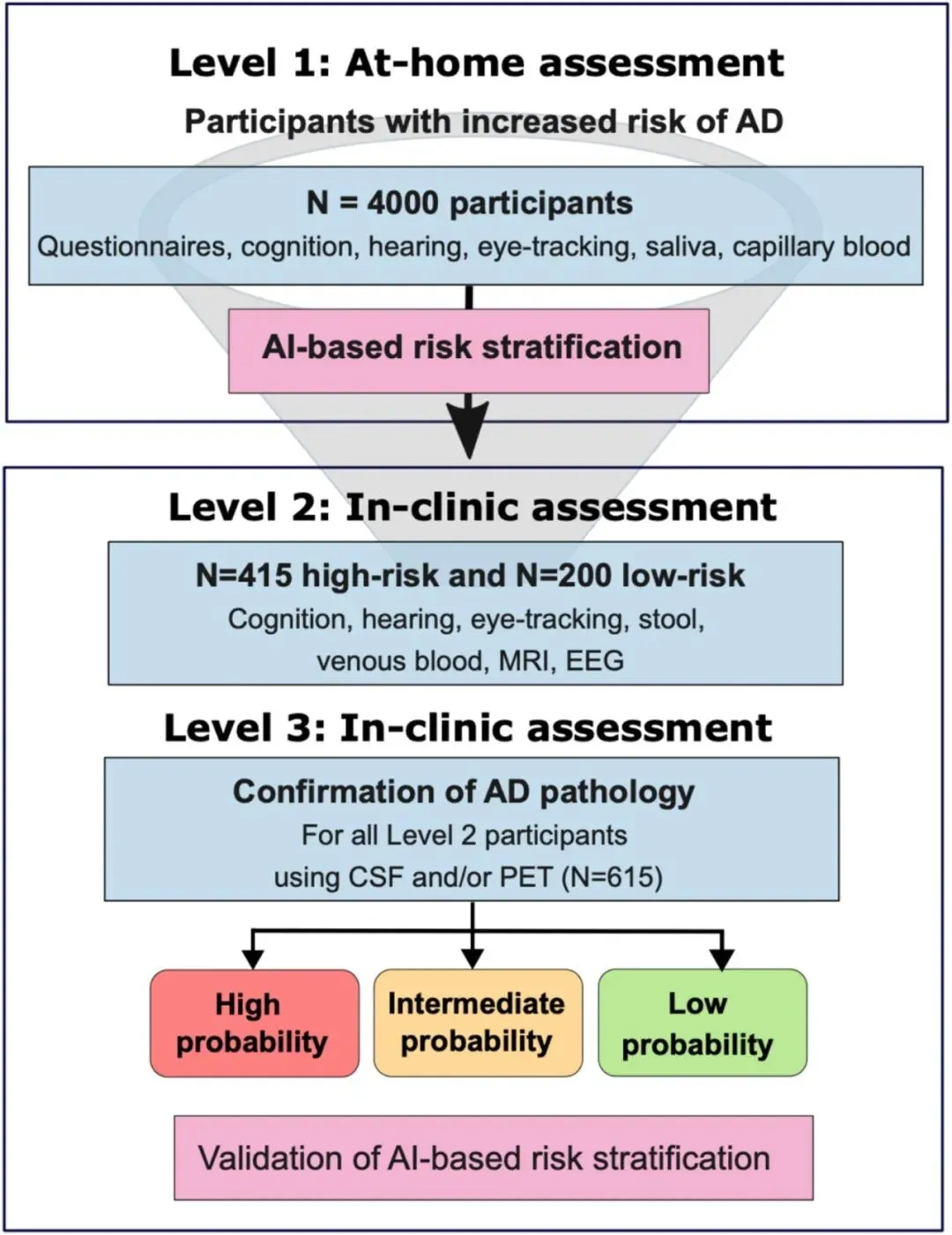 这是一项为期4年(2023年11月- 2027年10月)、覆盖欧洲七国(挪威、英国、法国、德国、瑞士、西班牙、比利时)的大型前瞻性队列研究,共纳入4000余名50岁以上、有AD风险因素的成年人。