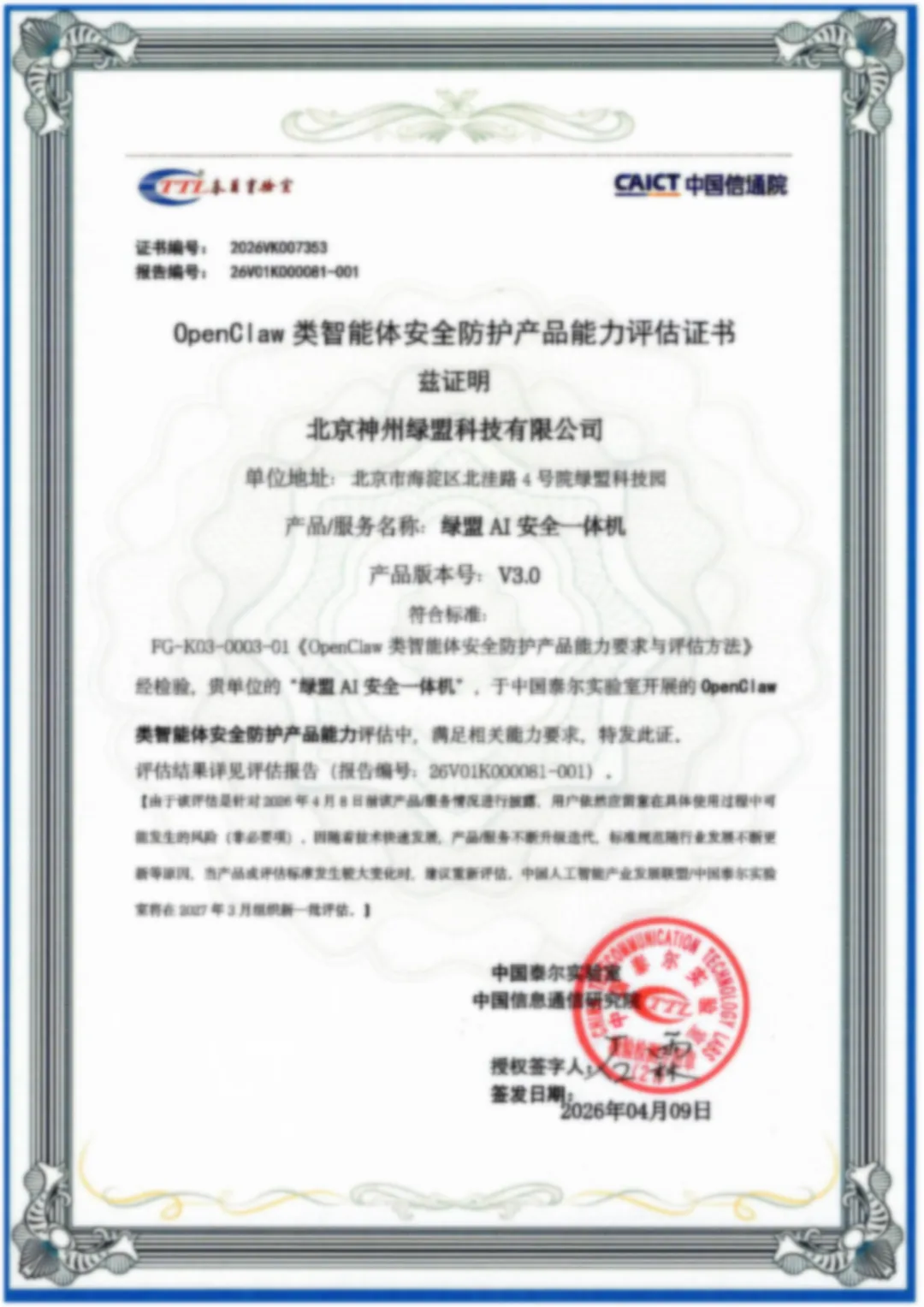 在首批评估中,北京神州绿盟科技有限公司的绿盟AI安全一体机顺利通过评估,获得能力评估证书。