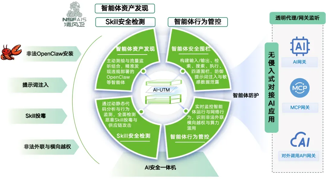 绿盟“清风卫”AI安全一体机(AI-UTM)是一款面向企业级AI应用全生命周期的一体化安全产品,以“无侵入、全围栏、管行为”为核心理念,推动大模型从“单点防护”向智能体“全流程闭环”安全升级。产品可精准测绘OpenClaw等“影子AI”资产,消除管理盲区。依托输入/输出、检索、搜索、执行四道安全围栏,深度检测Skills风险,有效防御技能投毒、API密钥窃取、横向越权等高级威胁。同时凭借,实时上下文感知能力,可对Agent敏感操作进行意图分析与风险阻断,保障AI智能体自主交互安全可控,为企业构建全流程闭环的AI应用安全防线。