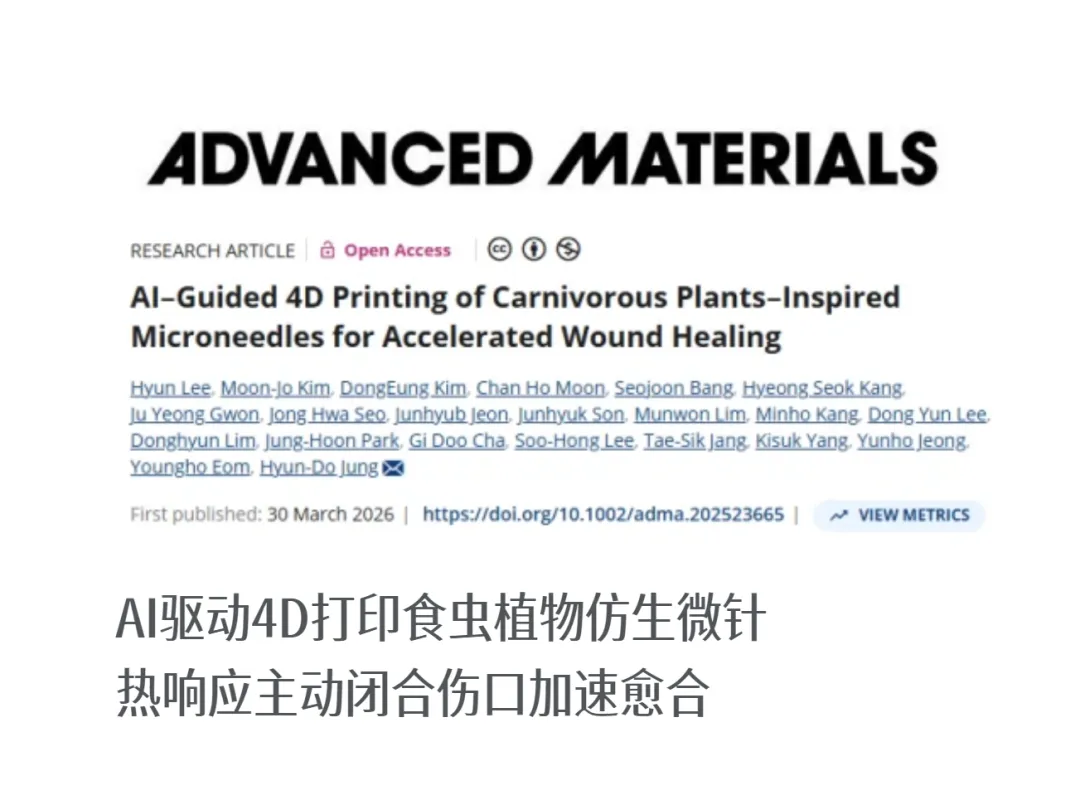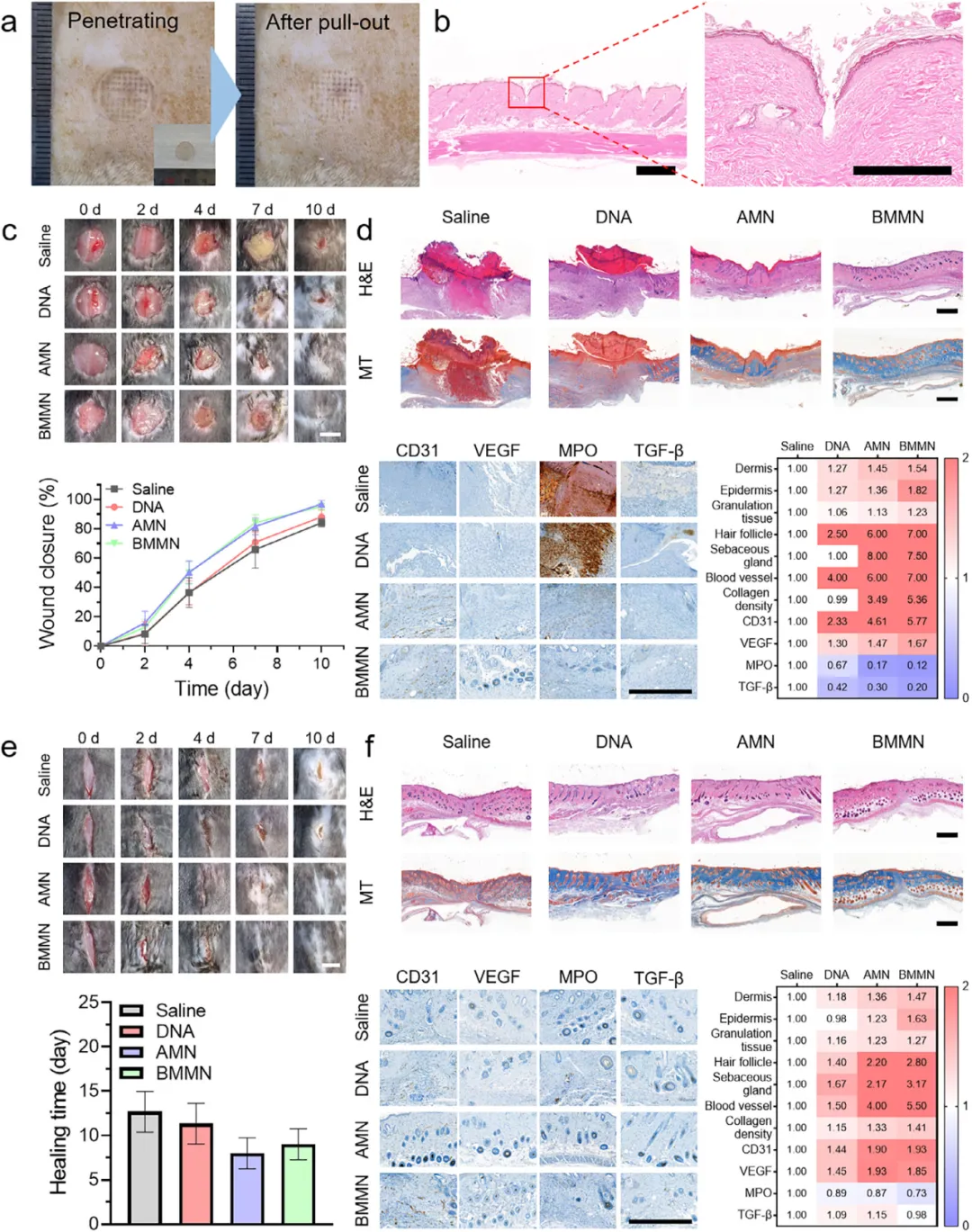 图6:微针可插入皮肤并加速伤口闭合,组织学及免疫组化显示胶原沉积、血管新生及再生因子上调,愈合效果优于对照组。