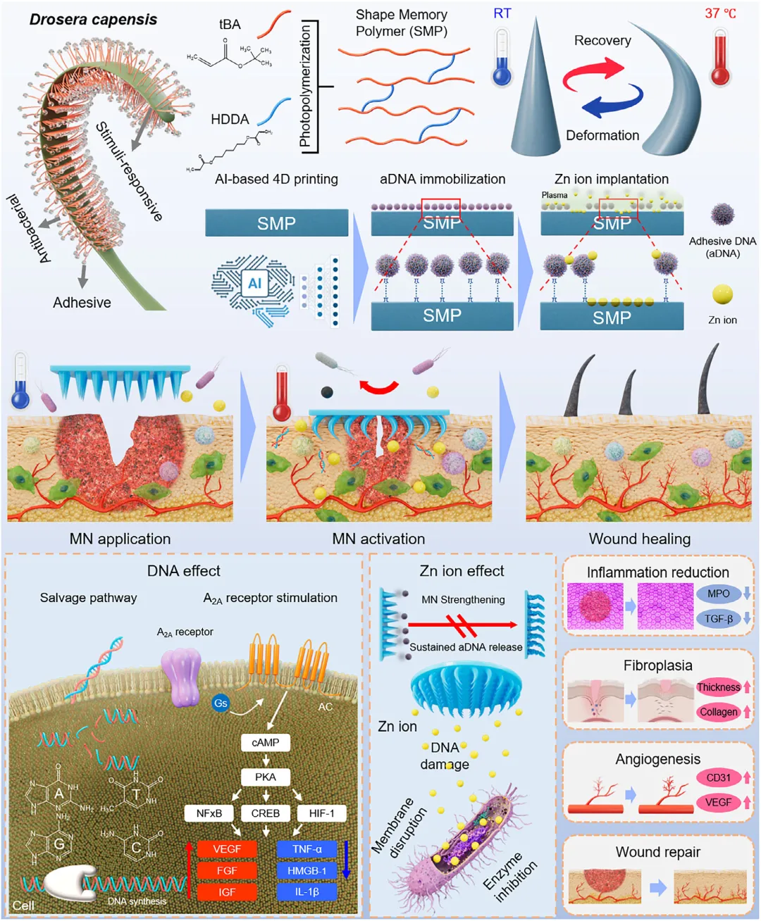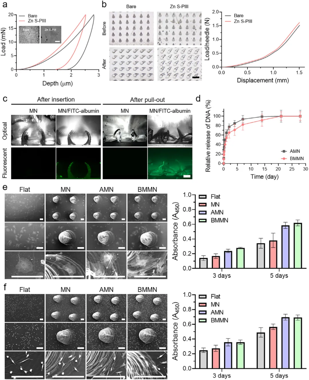图5:微针可刺入皮肤并负载DNA缓释,支持内皮细胞及成纤维细胞黏附与增殖,生物相容性良好。