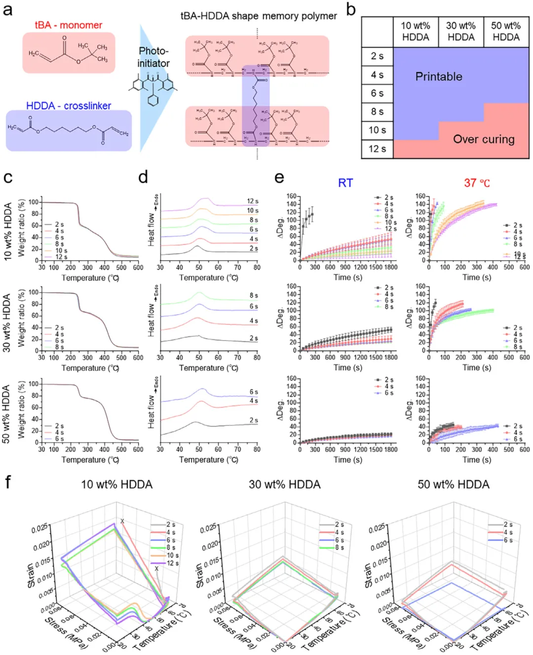 图1:展示了形状记忆聚合物的化学结构,区分了可打印与过固化条件。热重及差示扫描量热分析表明材料热性能稳定,环状样品在室温及37°C下均可实现形状恢复,热机械循环曲线证实其形状记忆行为。