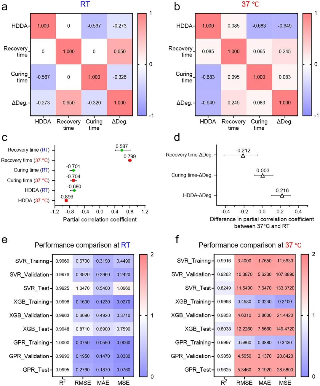 图2:RT与37°C下各变量相关矩阵不同,偏相关系数显示温度调控变量间关联强度,GPR模型预测性能最优。