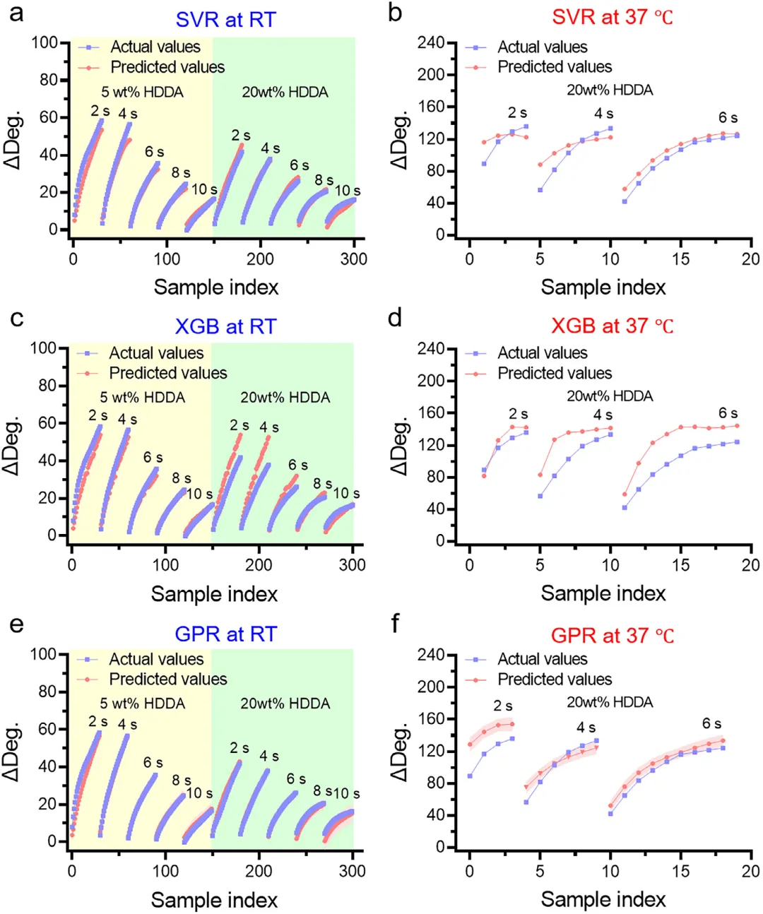图3:SVR、XGB及GPR模型均能预测不同固化条件下的变形轨迹,其中GPR精度最高且提供置信区间。