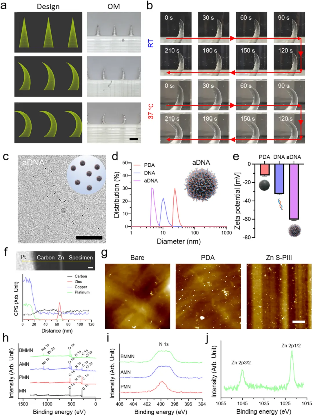 图4:可制备不同曲率微针,体积放大千倍后仍可恢复形状。aDNA粒径约100 nm,表面电位负值增大,ZnS-PIII处理改变表面元素组成及N 1s峰位。