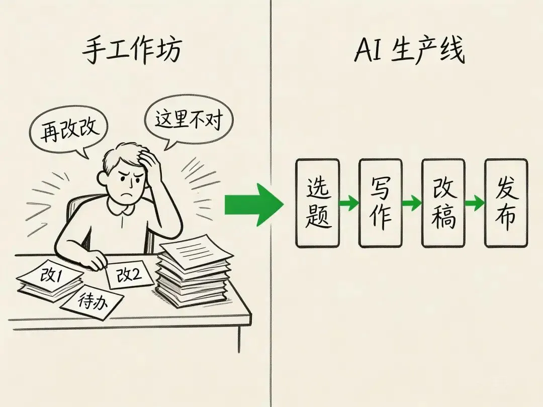 但问题是:你还是一篇一篇在跟它对话,一个一个在出内容。本质上还是手工作坊,不是流水线。