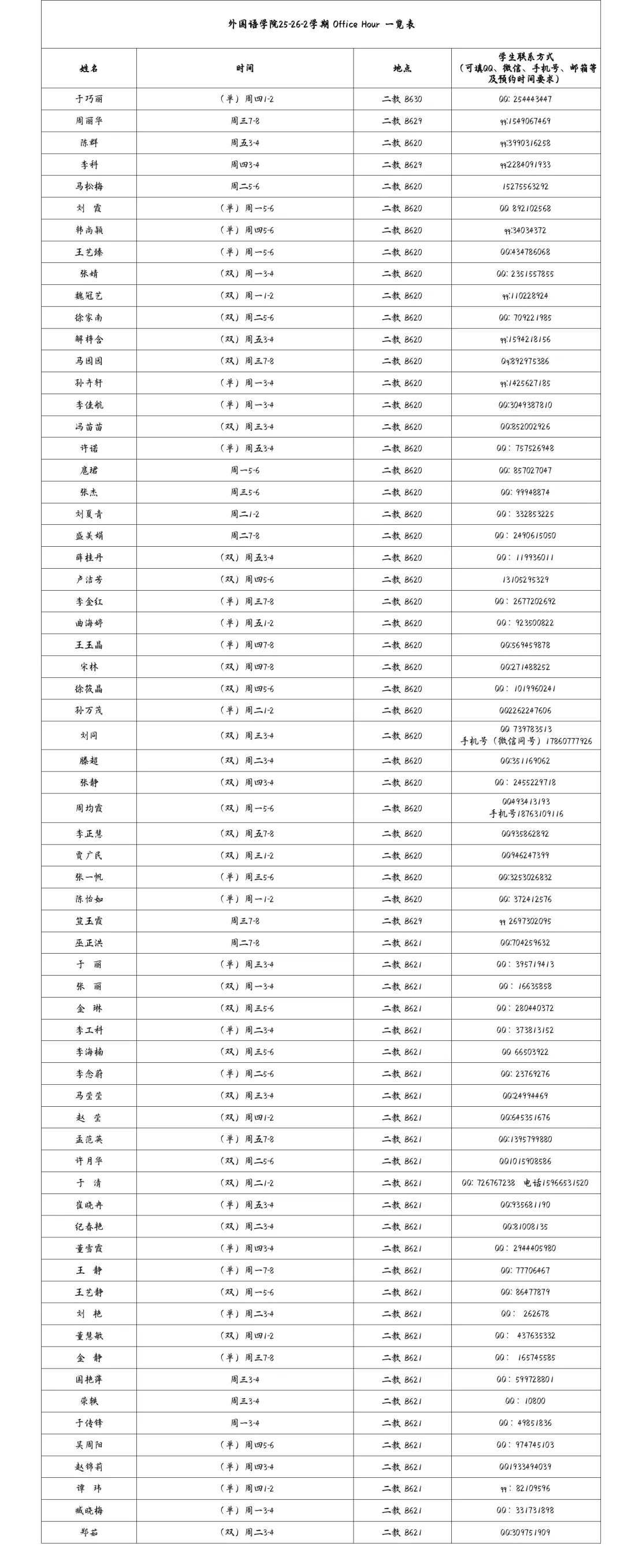 为深入落实立德树人根本任务,强化专任教师的育人职责,保障专人教师精准为学生提供课后答疑、学业指导、生涯规划等全方位学业支持,切实发挥教师教书育人功能,现将我院本学期专任教师Office Hour安排公布如下:
