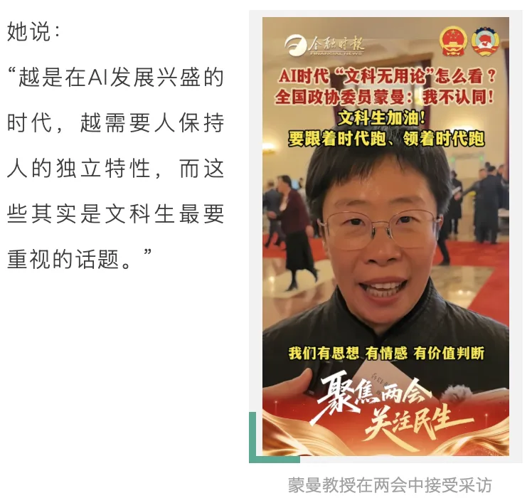 近日,在两会上,蒙曼教授面对记者的镜头,说出的一句“文科生,加油!”,像是一颗投入湖心的石子,在无数文科生的心里激起了巨大的涟漪。