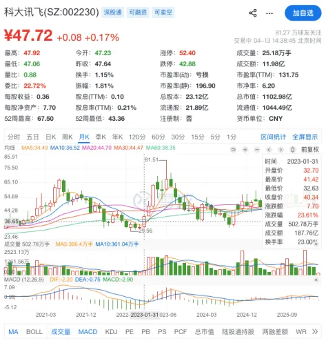 曾被誉为“A股AI龙头”的科大讯飞,在这场产业变革中经历了从巅峰到掉队的反差。其2023年股价半年暴涨超150%、市值逼近1900亿元,却在后续市场调整中持续回调,截至2026年4月股价较峰值大幅下滑,市值回落至千亿区间,蒸发数百亿。