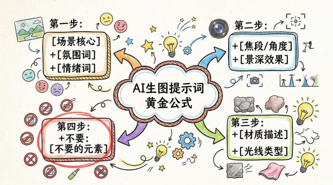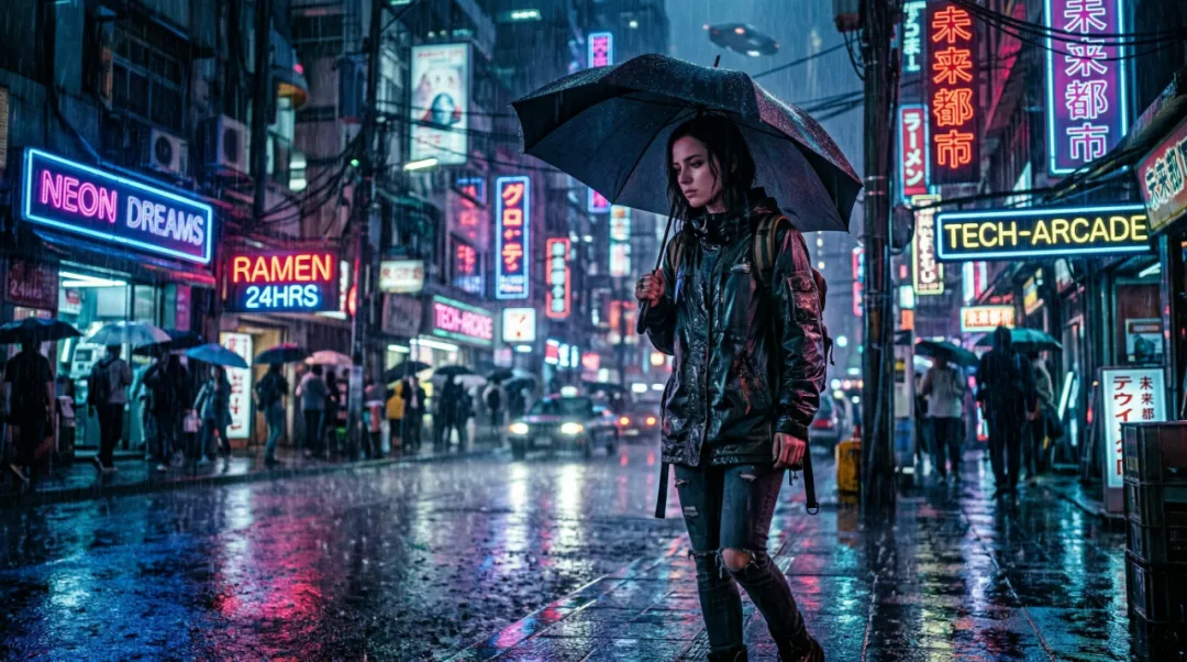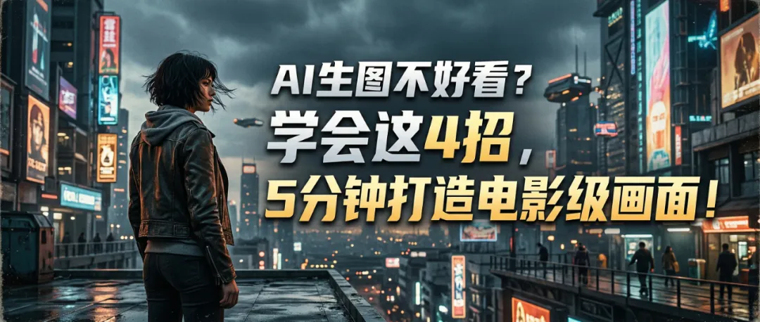 第一步:写场景加氛围 “赛博朋克东京街头,霓虹雨,科幻风女黑客” 第二步:加镜头语言 “35毫米电影镜头,广角,浅景深,变形镜头光晕” 第三步:精准材质加光线 “哑光皮夹克,湿漉漉的倒影街道,皮肤上的霓虹反射,戏剧性边缘光” 第四步:加负面提示词