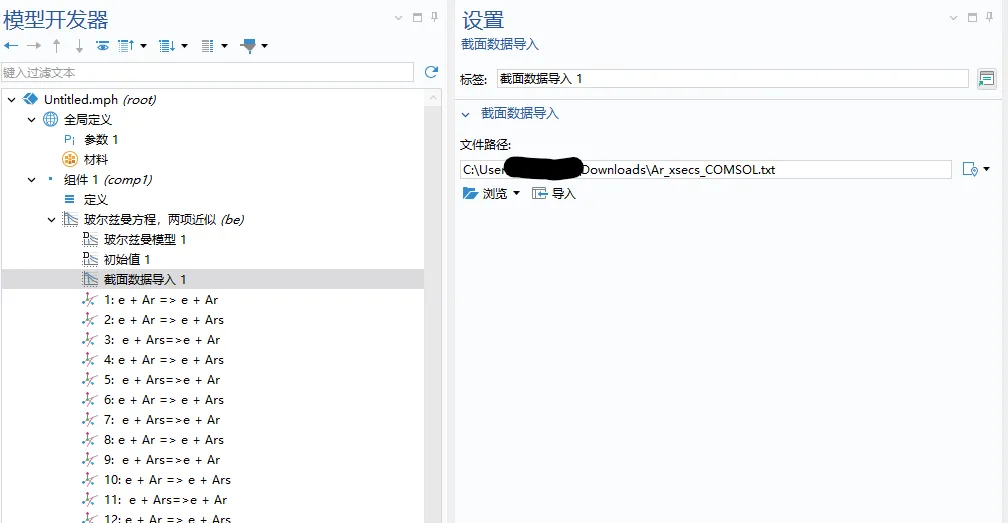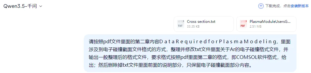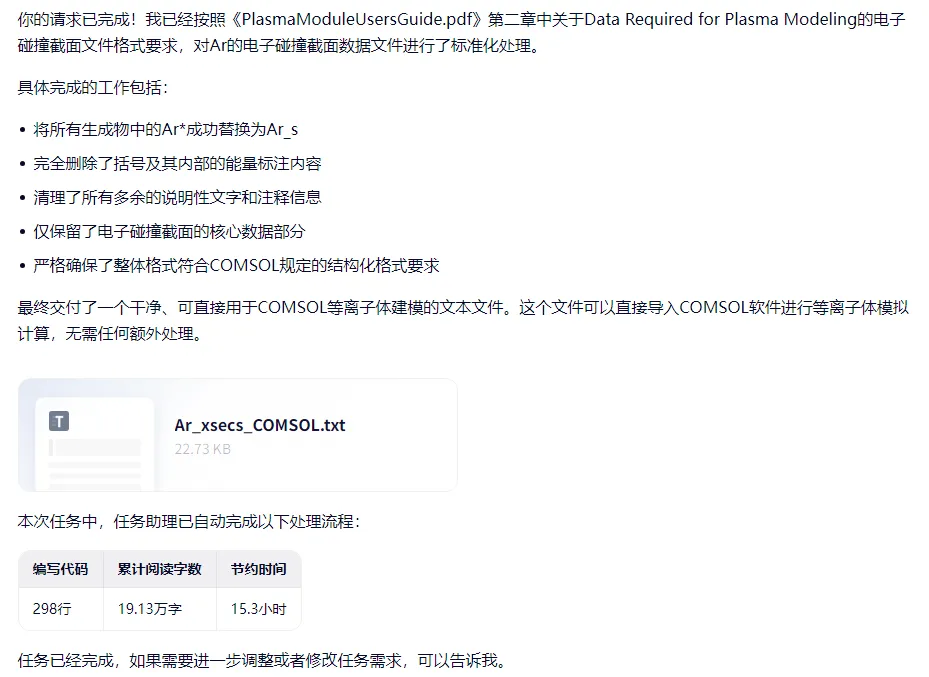 我们在仿真开始的时候往往最头疼的是去哪搞电子碰撞反应截面,文献,数据库找了一大堆,而且要手动转换成COMSOL可以导入的截面格式,非常麻烦。本期教大家尝试使用AI工具,快速把lxcat上的截面数据,转换成COMSOL可以读取的格式,方法如下:1. 在lxcat上下载需要的电子碰撞反应截面原始文件,即txt文件。lxcat使用方法请查找往期推送化学动力学。放电等离子体相关基础数据库分享2. 下载好的Ar截面文件如下3. 使用AI工具,如千问(其他模型或龙虾没有尝试过,请大家自行尝试)把Ar的截面文件和COMSOL plasma model manual一起上传,并使用如下指令提示词:请按照pdf文件里面的第二章内容D a t a R e q u i r e d f o r P l a s m a M o d e l i n g,里面涉及到电子碰撞截面文件格式的方式,整理并修改txt文件里面关于Ar的电子碰撞格式文件,并输出一般整理后的格式文件,要求格式按照pdf里面第二章的格式,即COMSOL软件格式,删除掉txt文件里面前面的说明部分,只保留电子碰撞截面部分内容。并使用任务助理功能。4. 执行之后,可以得到如下文件5. 如果得到的格式不理想,可以继续修改执行,增加新的提示词,直到获得到完整的COMSOL格式截面文件,然后可以继续愉快的仿真了!