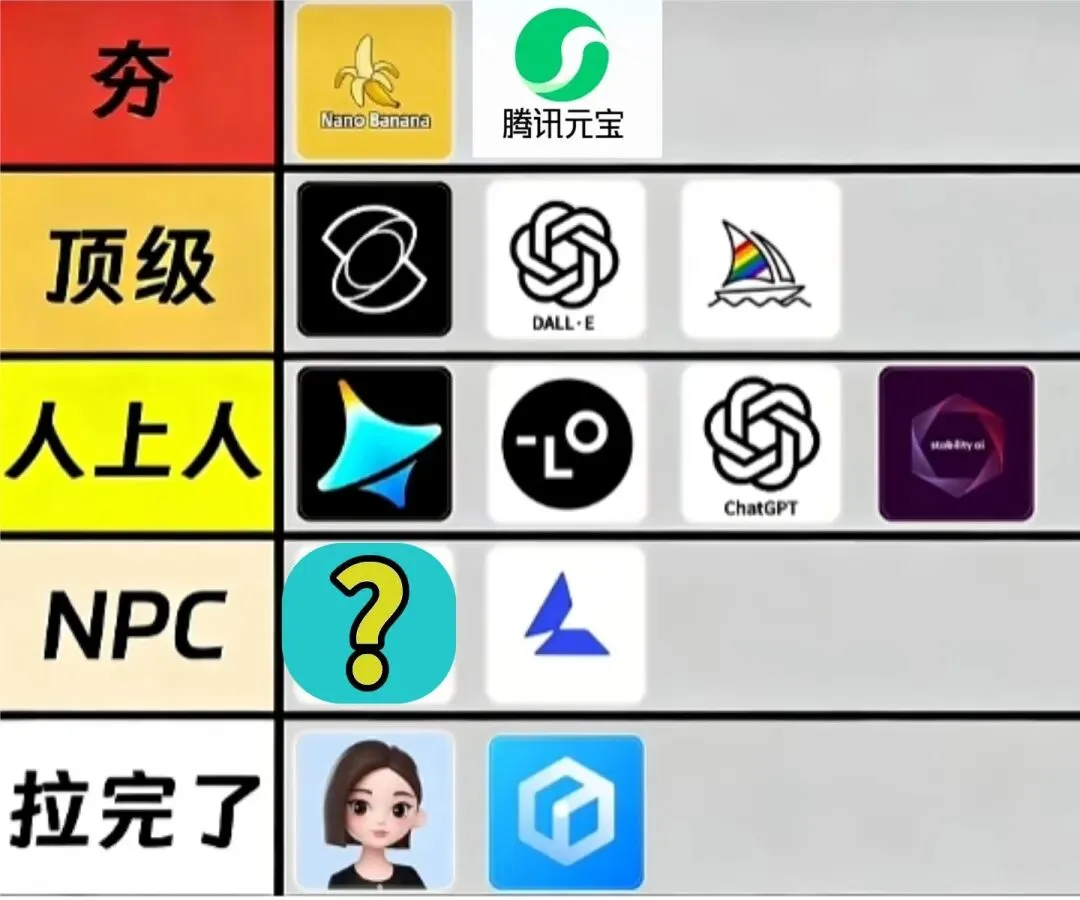 参照这张段位图,我把目前市面上主流的生图工具按实力分成了 **“神坛”、“顶流”、“人上人”、“工具人”和“凑数的”** 五个梯队。咱们用最扎心的实话,给大家排个名。
