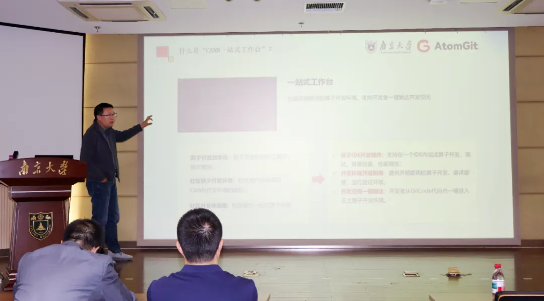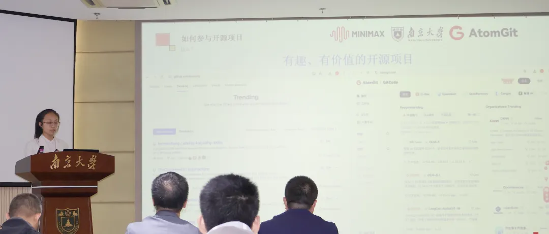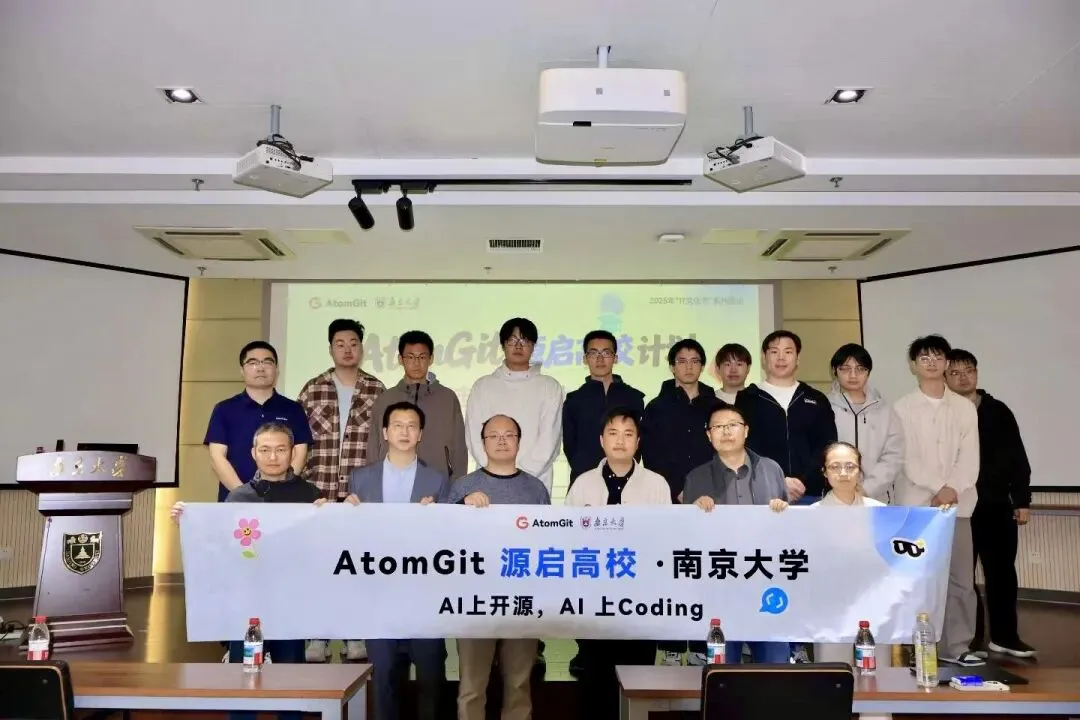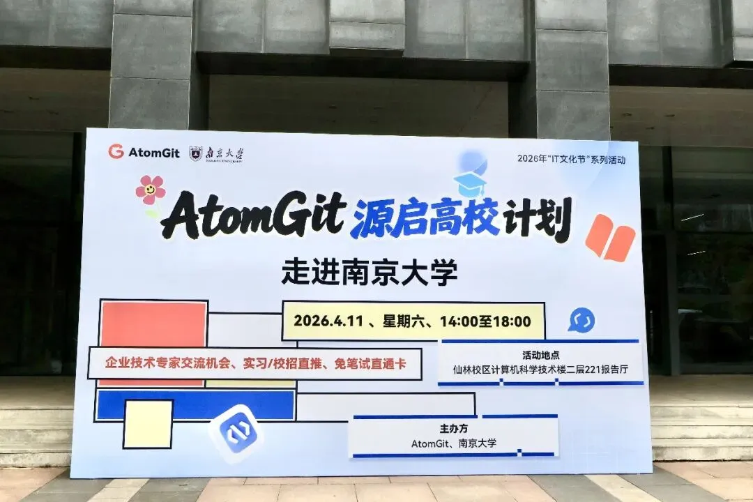 4 月 11 日,AtomGit「源启高校」计划走进南京大学仙林校区,以 「AI 上开源,AI 上 Coding」 为主题,搭建起高校与产业的技术桥梁。本次活动联动华为、知存科技、MiniMax 等生态伙伴,邀请 6 位一线技术专家带来硬核分享,南京大学学子到场参与,圆满落幕。