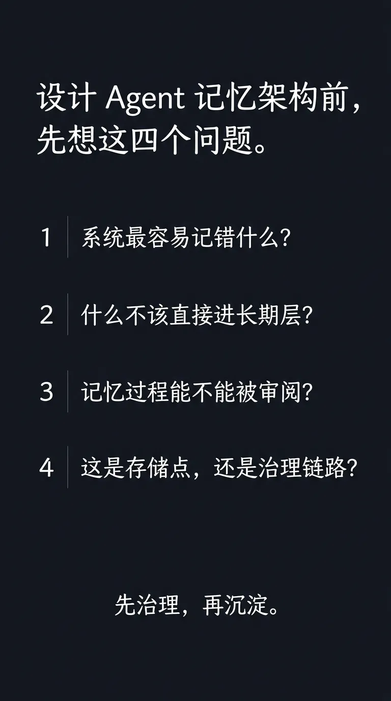 你的系统会记错什么? 大多数人上来就想容量和召回速度,但记忆架构第一个该担心的是污染。Agent跑得越久,矛盾信息、过时结论、噪音越多。处理不了这些,记忆量越大,表现退化越严重。怎么防,方案各有各的做法,但这个问题必须排在最前面。 然后是写入控制。长期记忆最怕进入太容易。一条信息被检索了一次就能直接写进持久化,这个通道就太宽了。中间得有关卡,不管是阶段隔离、评分筛选还是容量硬上限。 出了问题,你能查到是哪条记忆、什么时候、为什么被写进去的吗?完全黑箱的记忆系统没法debug。人类必须有办法看到记忆治理的过程。