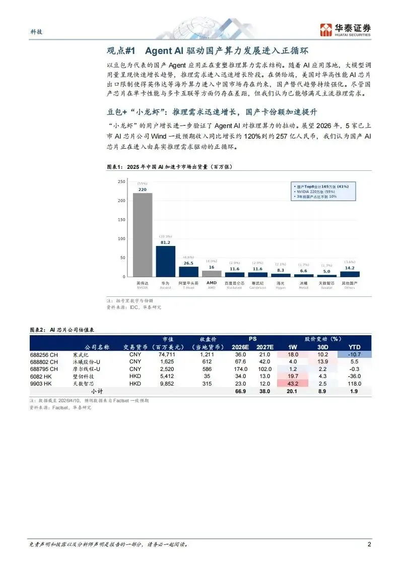 第一,以“小龙虾”为代表的Agent AI应用正在快速普及,国产算力芯片的需求来源已经从示范项目转向真实的市场需求,行业进入良性发展阶段。