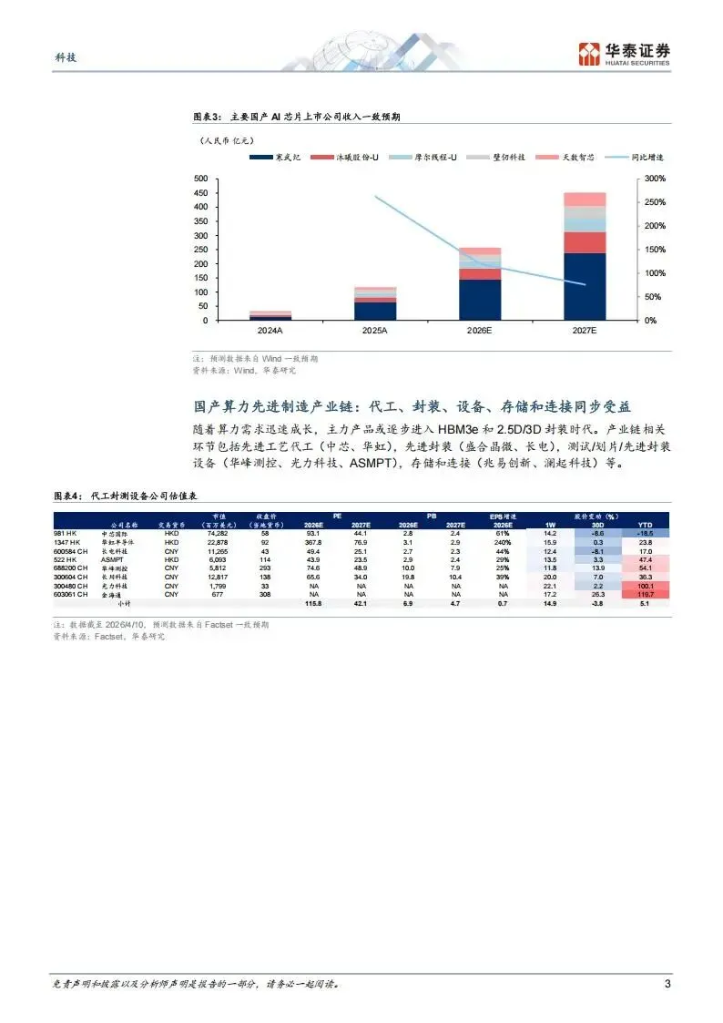国产算力芯片的放量,也带动了产业链上游的制造、封装、设备、存储和连接等环节。随着算力产品逐步向HBM3e和2.5D/3D封装演进,先进工艺代工(中芯国际、华虹半导体)、先进封装(盛合晶微、长电科技)、测试及封装设备(华峰测控、光力科技、ASMPT)、存储和连接芯片(兆易创新、澜起科技)等环节均同步受益。