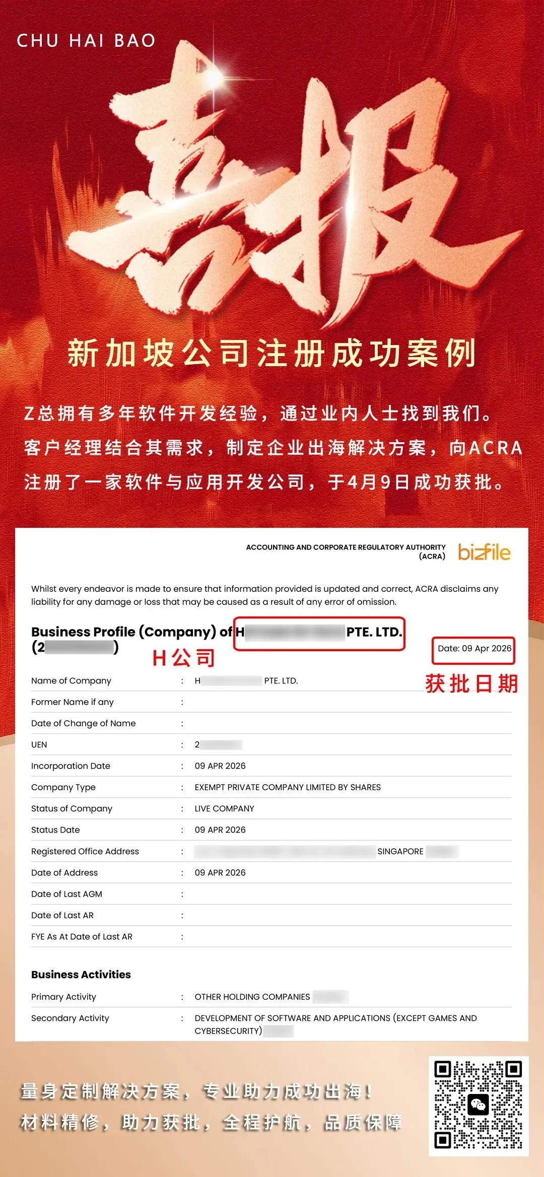 针对Z总要做的软件开发,客户经理去查了新加坡ACRA最新的SSIC代码(2025年更新版),给他选了软件开发这个的类别。控股那部分也在公司章程里写明了“股权投资”的表述,免得以后经营范围出问题。