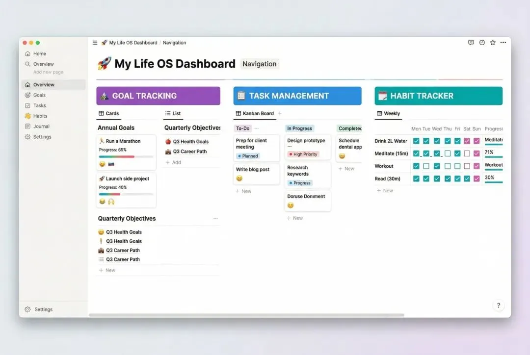 代表产品: Thomas Frank 的 Ultimate Life OS销量: 10,000+ 份定价: $49-99核心功能: 目标管理 + 任务系统 + 习惯追踪 + 笔记库