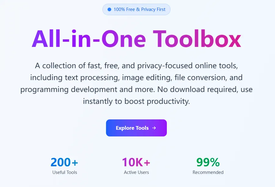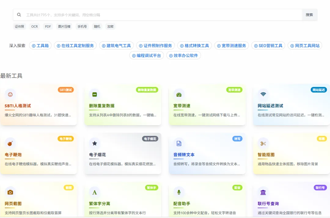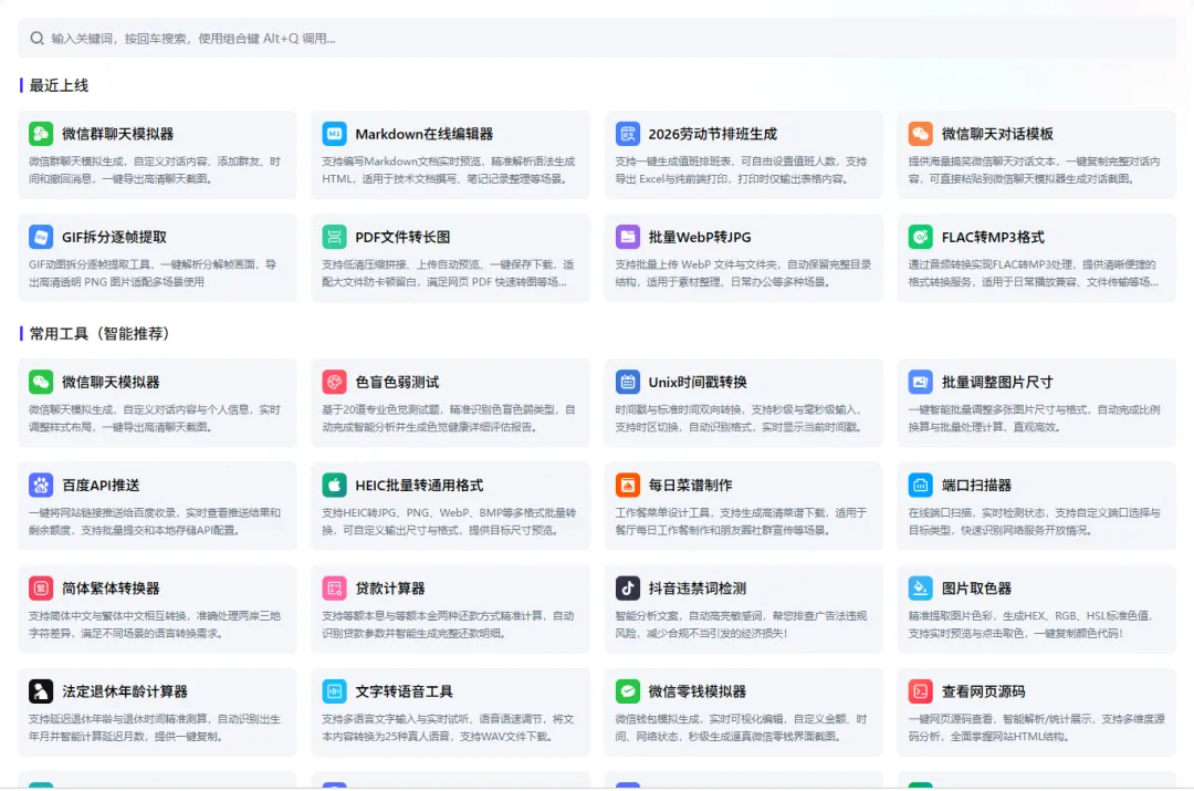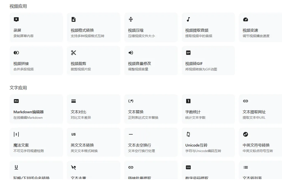 🎬 视频处理:视频压缩(减小体积不损失太多画质) 🎧 音频处理:音频格式转换(FLAC↔MP3/WAV等) 🖼️ 图片处理:图片编辑、裁剪、格式转换 📄 文档/PDF:PDF合并拆分、文档格式转换 📱 二维码生成:各类二维码一键制作 📝 文本工具:字数统计、文本去重 ⚙️ 单位换算:长度/重量/温度/面积全覆盖
