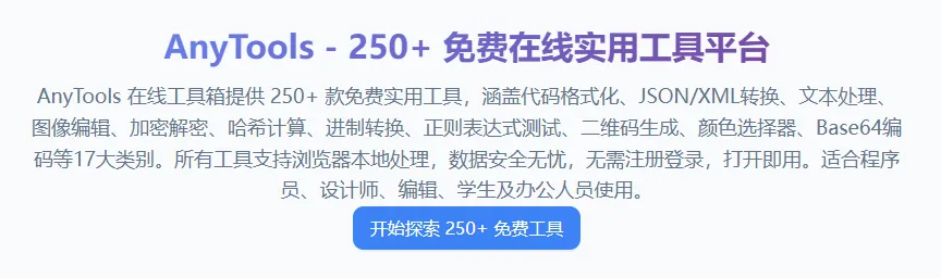 场景3:学编程/做开发 → AnyTools + devtoolbox.onlineAnyTools搞定高阶需求(反编译/格式化/Docker),devtoolbox做基础工具的无广告备用。