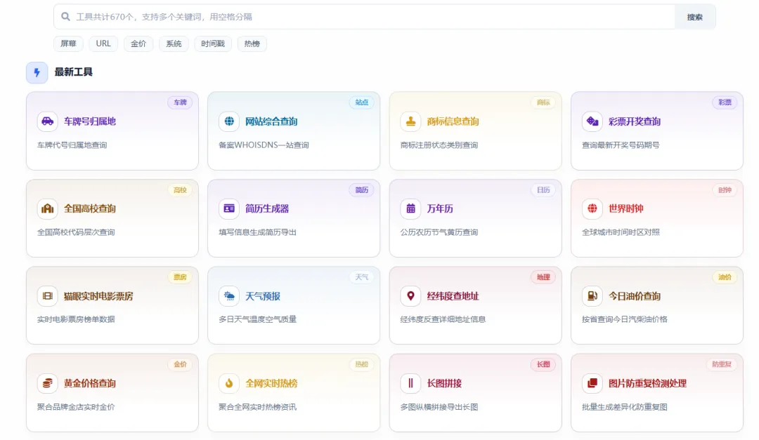 📊 实时数据查询(特色): 国内油价查询(92#/95#/98#今日价格) 国际金价查询(实时更新) 彩票开奖结果(双色球/排列3/大乐透等) 天气预报、电影票房实时数据 🔢 计算器:科学计算器、BMI计算器、理想体重、单位换算 🖼️ 图片工具:长图拼接、取色器、圆角制作、PNG加背景色 📋 文本/编程:文本处理、密码学工具、DNS/IP查询 🎓 生活便民:车牌归属地查询、高校信息查询、简历生成器