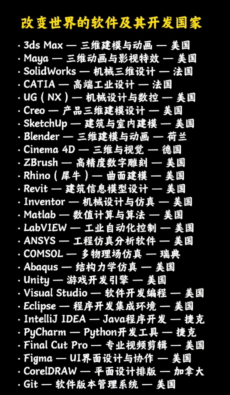 最近一张软件清单的截图在程序员圈、设计圈疯传 —— 上面列着改变世界的核心软件,还精准标注了所属国家。看完才发现:原来塑造现代文明的数字工具,背后藏着如此清晰的全球技术版图。