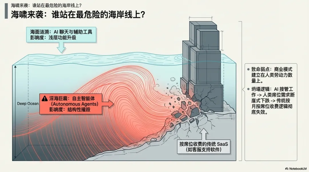 那些只靠贩卖软件界面、按人数收费、提供浅层效率工具的传统SaaS,的确正站在海啸正中央。它们最危险,不是因为没接 AI,而是因为它们的价值本来就建立在“人要手动操作”这件事上。一旦执行者从人变成智能体,原有价值锚点就会迅速失效。仅仅给旧系统加一层 API 外挂,不足以挡住真正的结构性冲击。