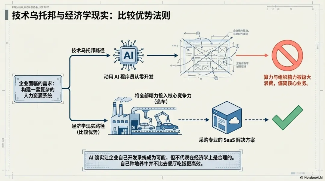 比如一家汽车公司,它的核心竞争力是造车,是研发、生产、销售与品牌,而不是维护一套极其复杂的人力资源系统。汽车公司当然可以让AI 从头做一套,但如果把大量算力、时间、组织精力都投入到这种非核心能力上,从经济学角度看,这本身就是巨大的浪费。