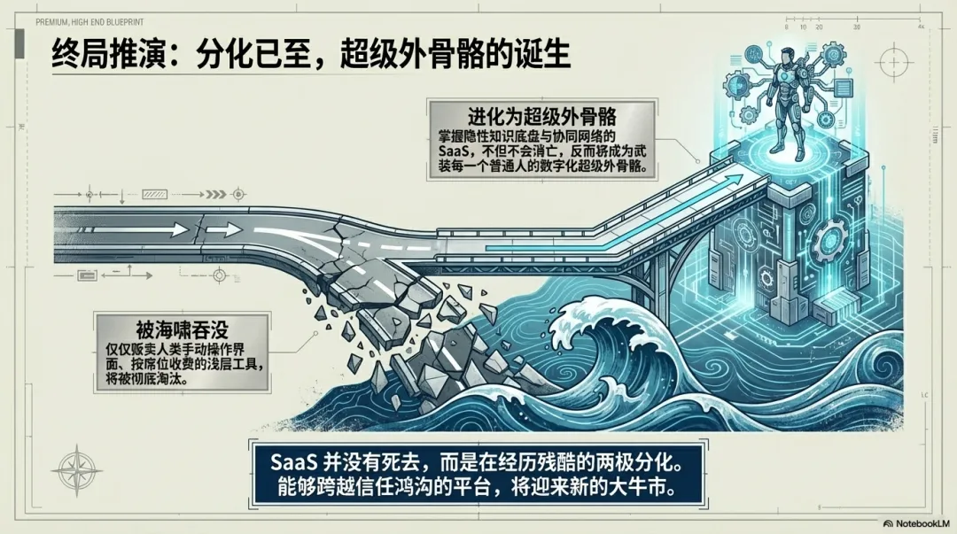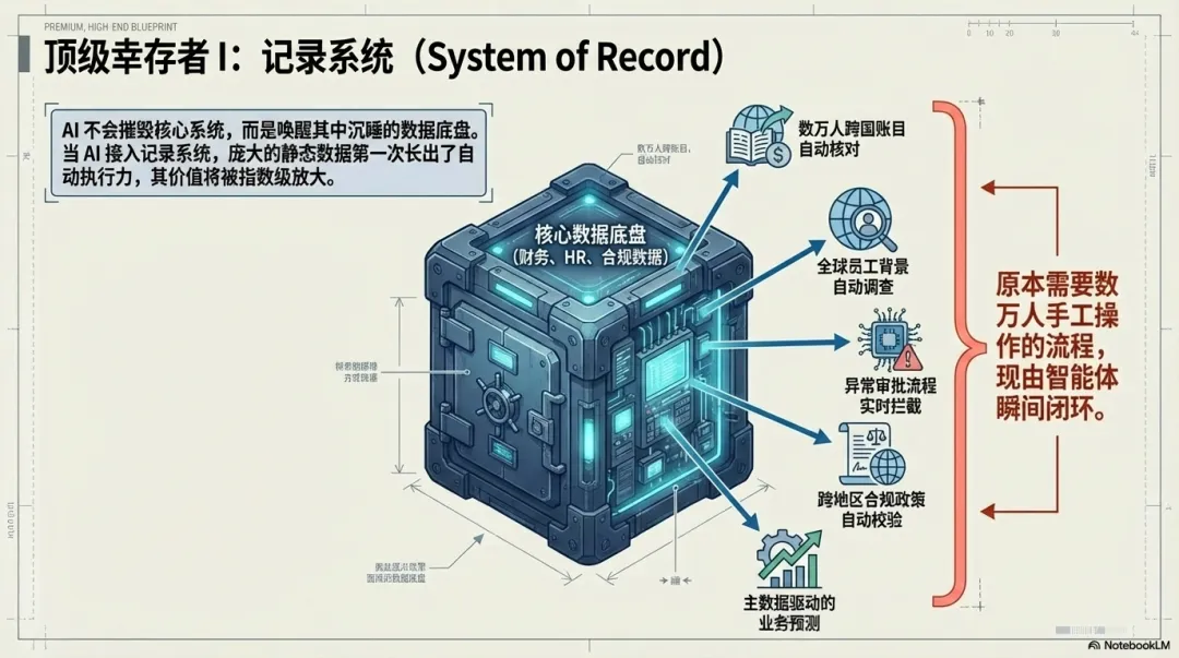 真正危险的,是那些只提供一层薄薄交互界面、只贩卖“人类工作效率”的简单工具;而那些掌控深厚业务逻辑、充当企业记录系统的SaaS公司,反而可能迎来新的大牛市。