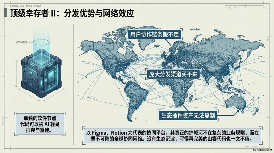 第二类,是拥有强分发能力、庞大网络效应和协作生态的平台型软件。它们的真正壁垒不是功能,而是用户关系、生态密度与分发渠道。