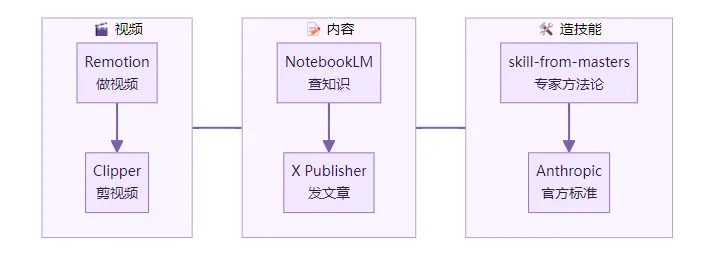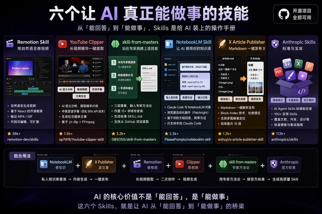 开源地址:Remotion Skill[1] · YouTube Clipper[2] · skill-from-masters[3] · NotebookLM Skill[4] · X Article Publisher[5] · Anthropic Skills[6]
