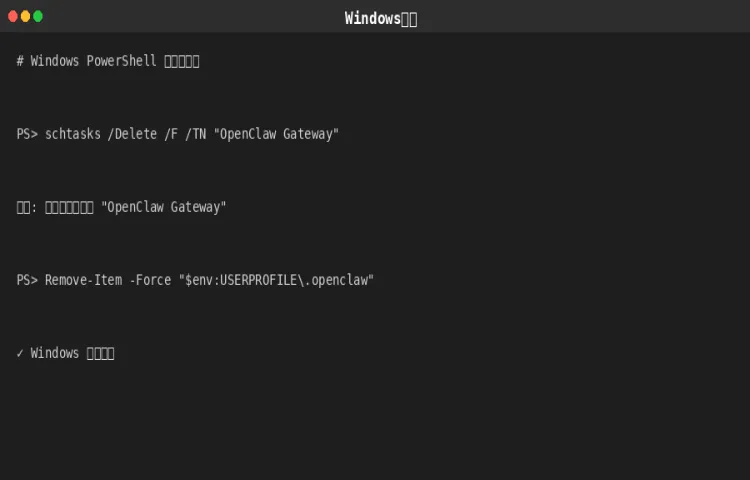 如果 openclaw uninstall 命令失败,请按照第三章手动卸载步骤操作。