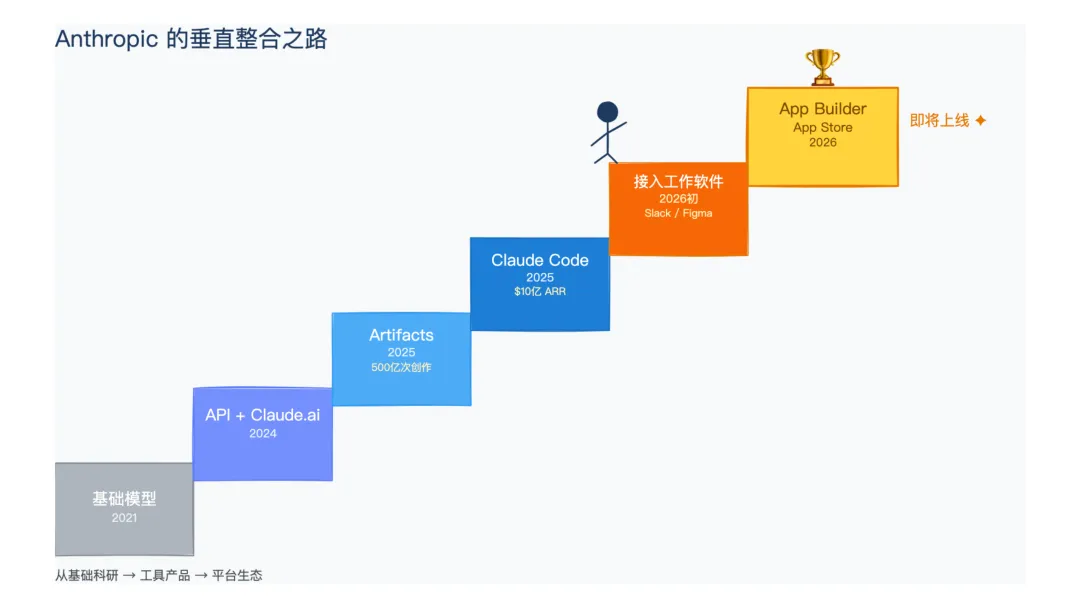 这条路线的逻辑是:先让用户用 Claude 做东西(Artifacts),再让开发者用 Claude 写代码(Claude Code),最后让所有人用 Claude 直接构建应用(App Builder)。