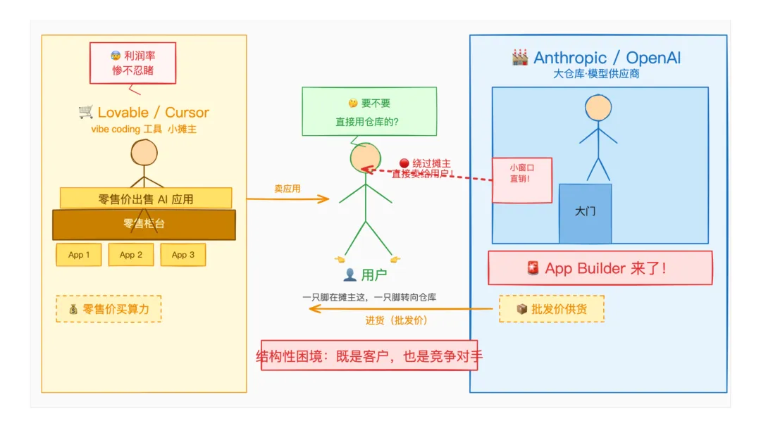 但整个 vibe coding 赛道有个结构性的脆弱:它们买的是模型厂商的算力,却在和模型厂商争用户。