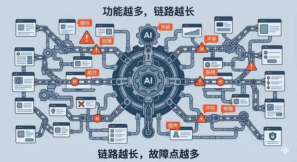 但问题也在这儿。功能越多,链路越长;链路越长,潜在故障点就越多。平时看不出来,一到升级、冲突、依赖错位,这些东西就会一起冒出来。你本来只是想干活,最后却坐在那里排查到底是哪个插件拖垮了哪个插件。