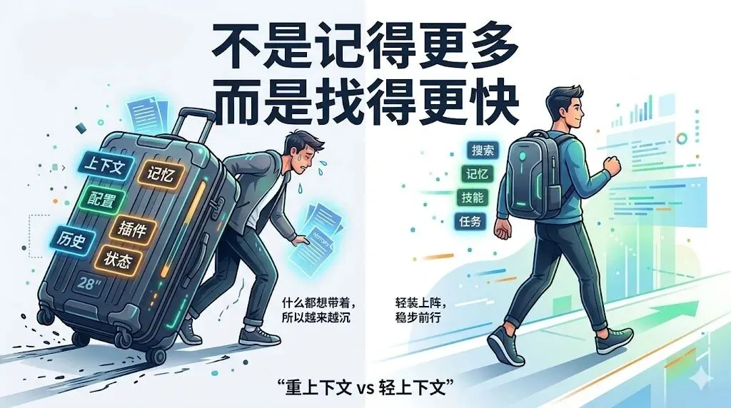 OpenClaw 的做法,有点像出门前什么都舍不得落下。各种设定文件一股脑往上下文里塞。刚开始你会觉得很安心,像是准备得很充分。