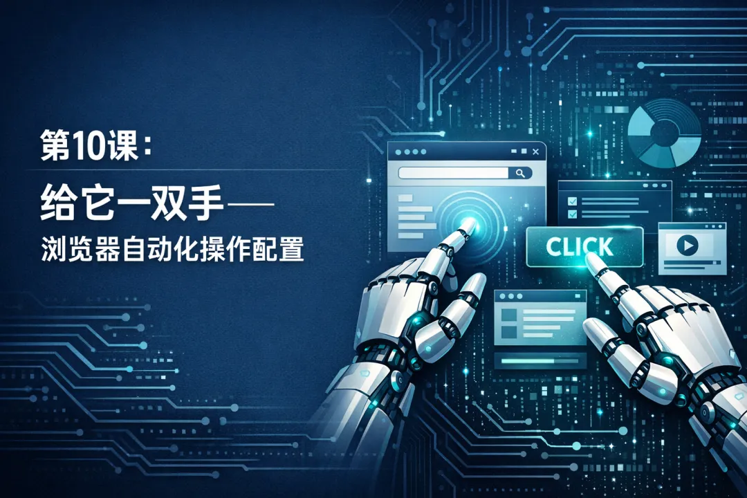 这节课给 OpenClaw 装上「一双手」。配置好以后,你只需说「帮我查一下XX的价格」「去这个网站帮我提交表单」,AI就能自动操控浏览器完成任务——像你的数字助理一样。