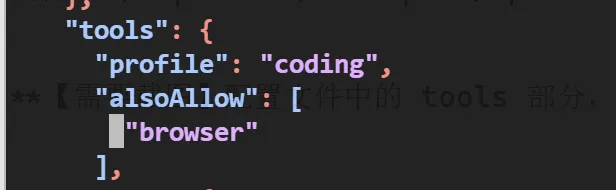 编辑 ~/.openclaw/workspace/openclaw.json,在 tools 部分添加 alsoAllow 数组。