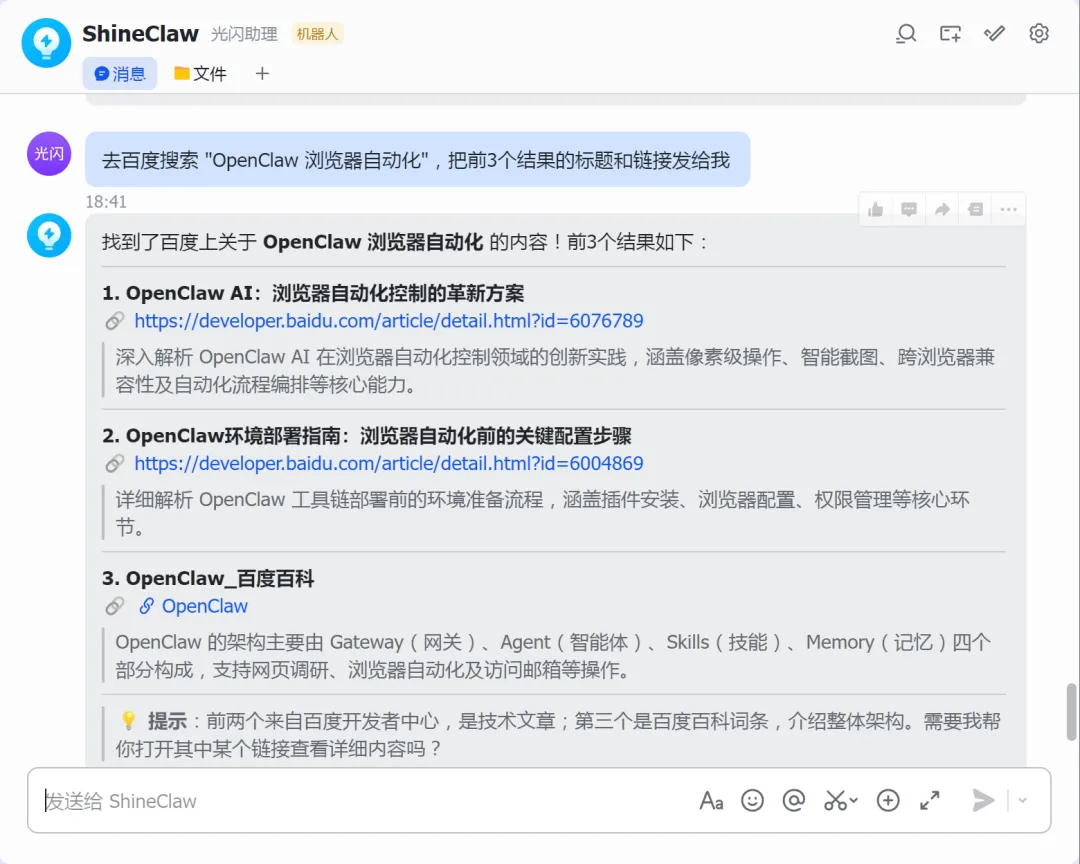 去百度搜索 "OpenClaw 浏览器自动化",把前3个结果的标题和链接发给我