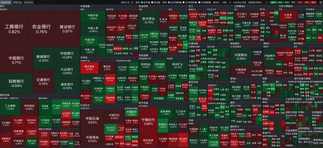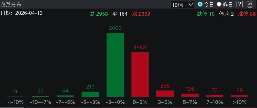 今天的 A 股算是和伊朗局势脱敏成功了,上周随着原油价格的波动,A 股还会做反应。到了今天,可以看到涨跌分布里面,基本都维持在了不涨不跌的 -3% 到 +3% 的区间里面。