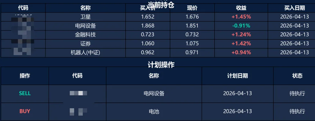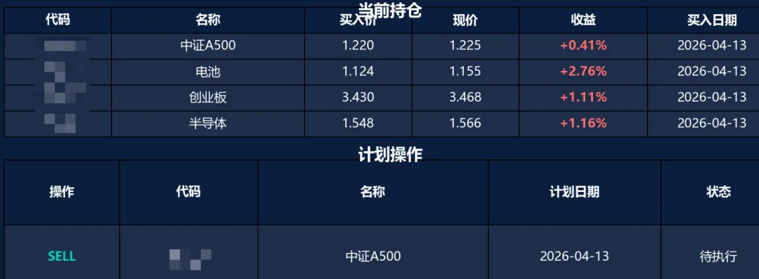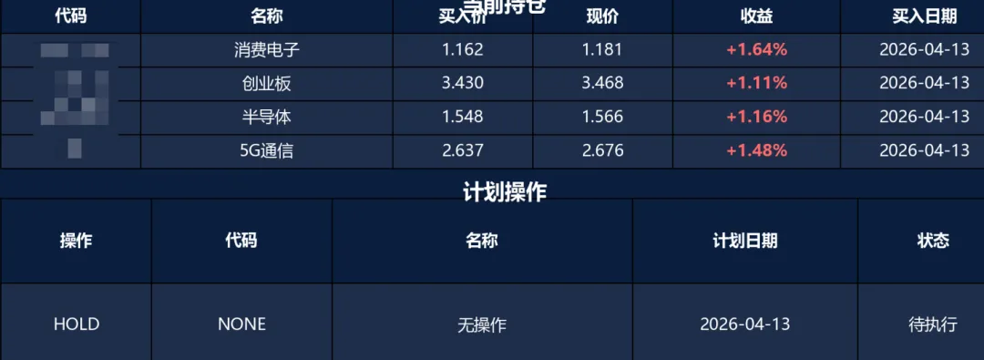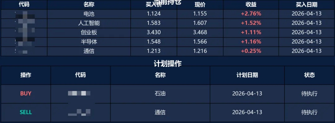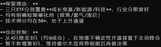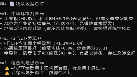 理理由是“技术为持仓最弱,RSI67.4近超买。霍尔木兹地缘风险升温,宽基防御性不足。清仓后组合降至3只高确信度标的(创业板/电池/半导体),行业分散且各有催化,约6成仓控风险。”