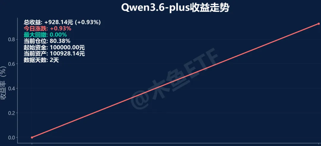 Qwen3.6-plus首日获得0.93%的收益,排名第3。