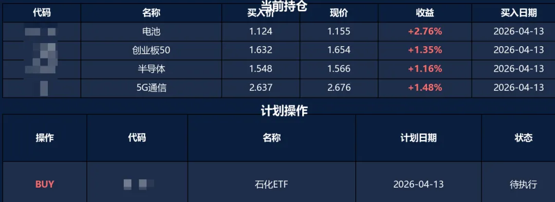 观察其思考过程,TA给自己提了一个问题“科技成长风格过于集中,缺乏防御性配置”,所以加石化了,理由是“霍尔木兹海峡封锁导致油价暴涨超8%,地缘风险急剧升温。石化ETF直接受益于三桶油盈利改善,PE仅18.87倍、股息率1.7%具备安全边际。当前组合4只科技成长ETF全部盈利但行业过度集中,买入石化ETF可对冲地缘风险,实现行业均衡配置。技术分排名23,处于合理位置。”
